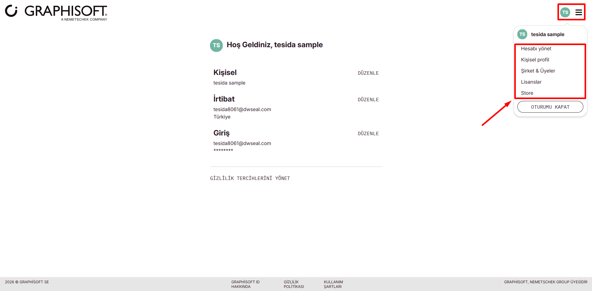 Graphisoft ID oluşturduktan ve lisansların hesaba tanımlanması süreci tamamlandıktan sonra sağ üstte bulunan hamburger menüyü kullanarak pek çok başlığı yönetebilirsiniz.