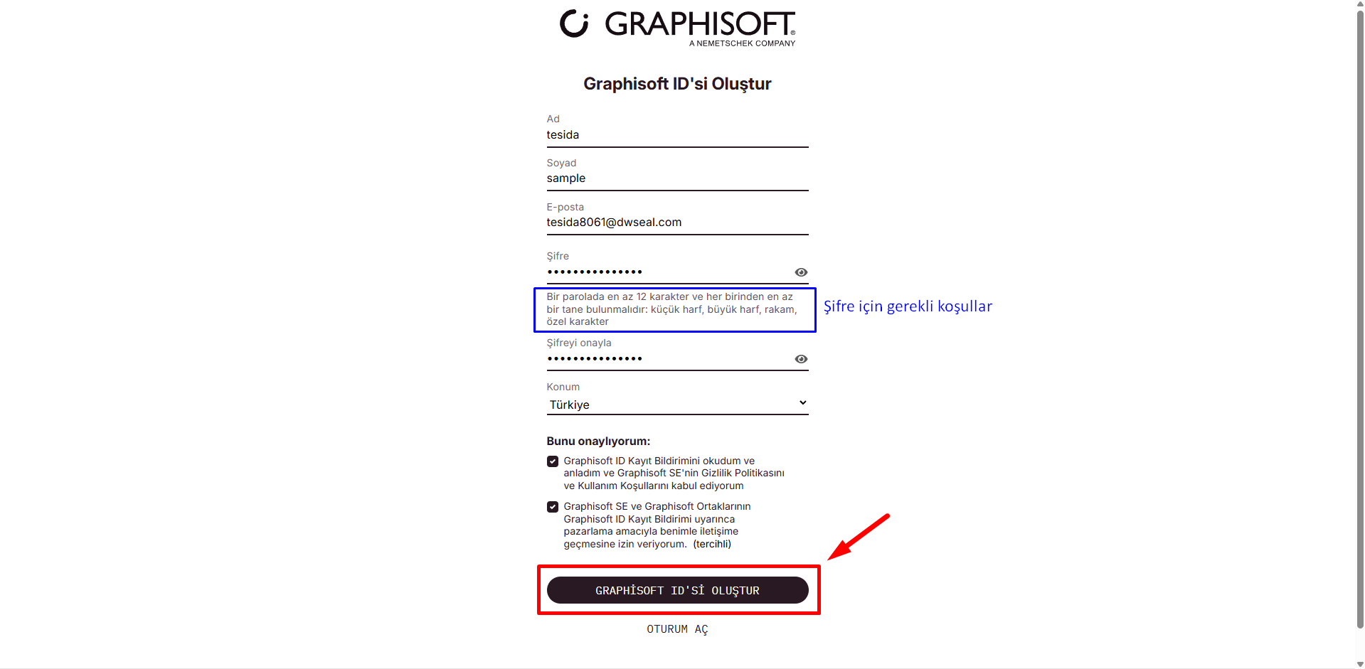 3- Şifre için gerekli koşullara dikkat ederek gerekli bilgileri dolduruyoruz. Ardından "GRAPHISOFT ID'Sİ OLUŞTUR" butonuna tıklıyoruz.