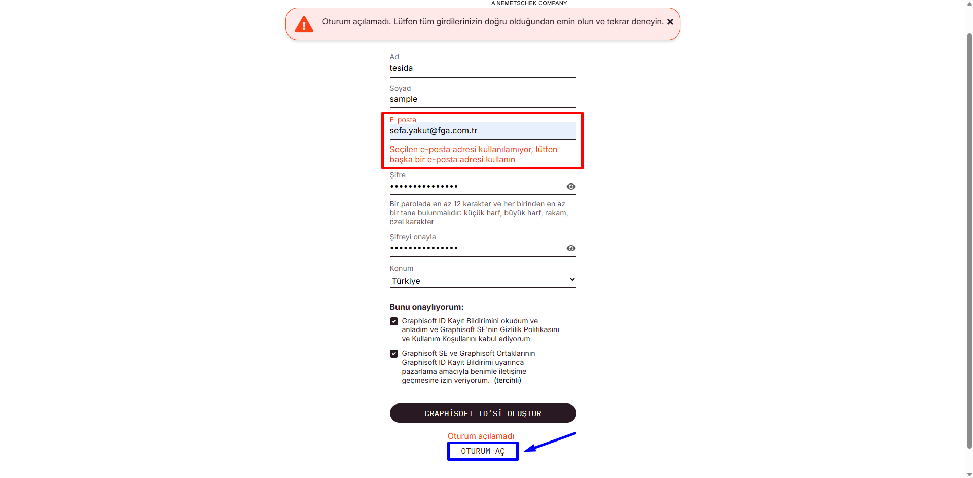 4- Eğer bu butona bastıktan sonra "SEÇİLİ E-POSTA ADRESİ KULLANILAMIYOR." hatasını alırsanız, bu e-posta ile daha önce Graphisoft ID oluşturulmuş demektir. "Oturum Aç" ekranına geri dönüp "ŞİFRENİZİ UNUTTUNUZ MU?" butonuna tıklayabilir, e-postanıza şifre sıfırlama bağlantısı gönderebilirsiniz.
