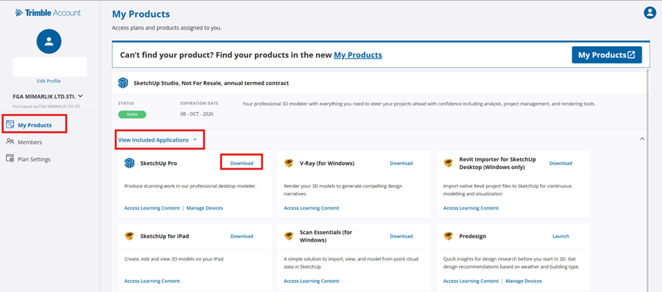 included applications içerisinden SketchUp’ı indirebilirsiniz.
