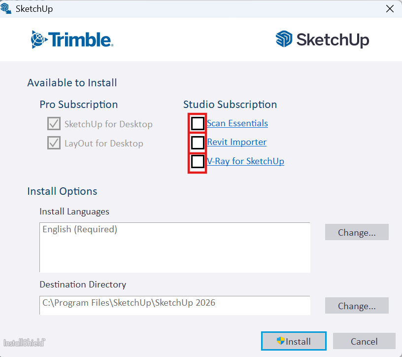 işaretini kaldırın , SketchUp Studio paketine sahipseniz tik işaretleri varken